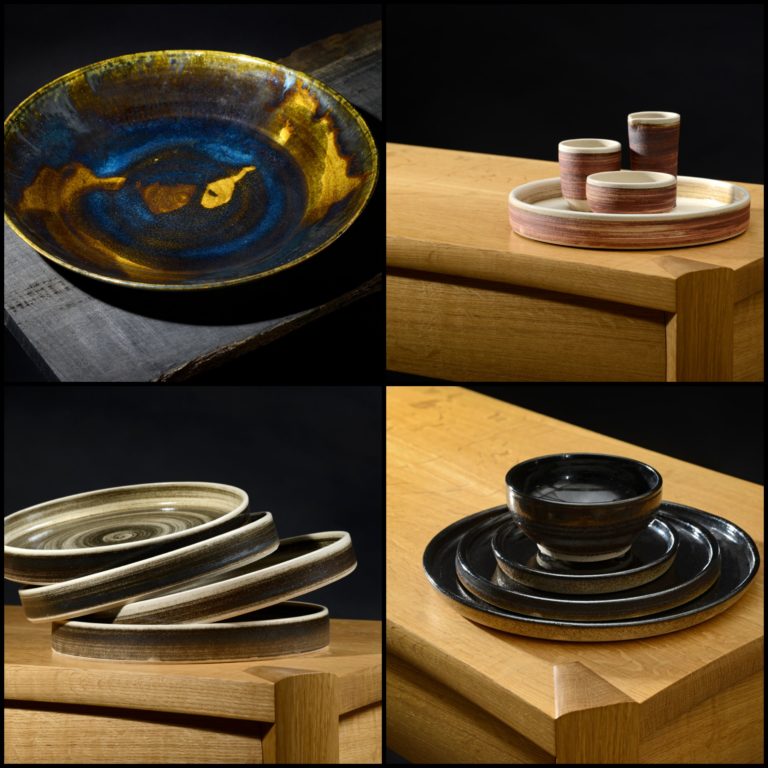 Pictured here are a Bog Oak Ash Glazed platter, a set of Florence Iron decorated dining ware, a stack of plates using Stainless Steel and a stack of dining ware decorate with Cumbrian slate and iron.
